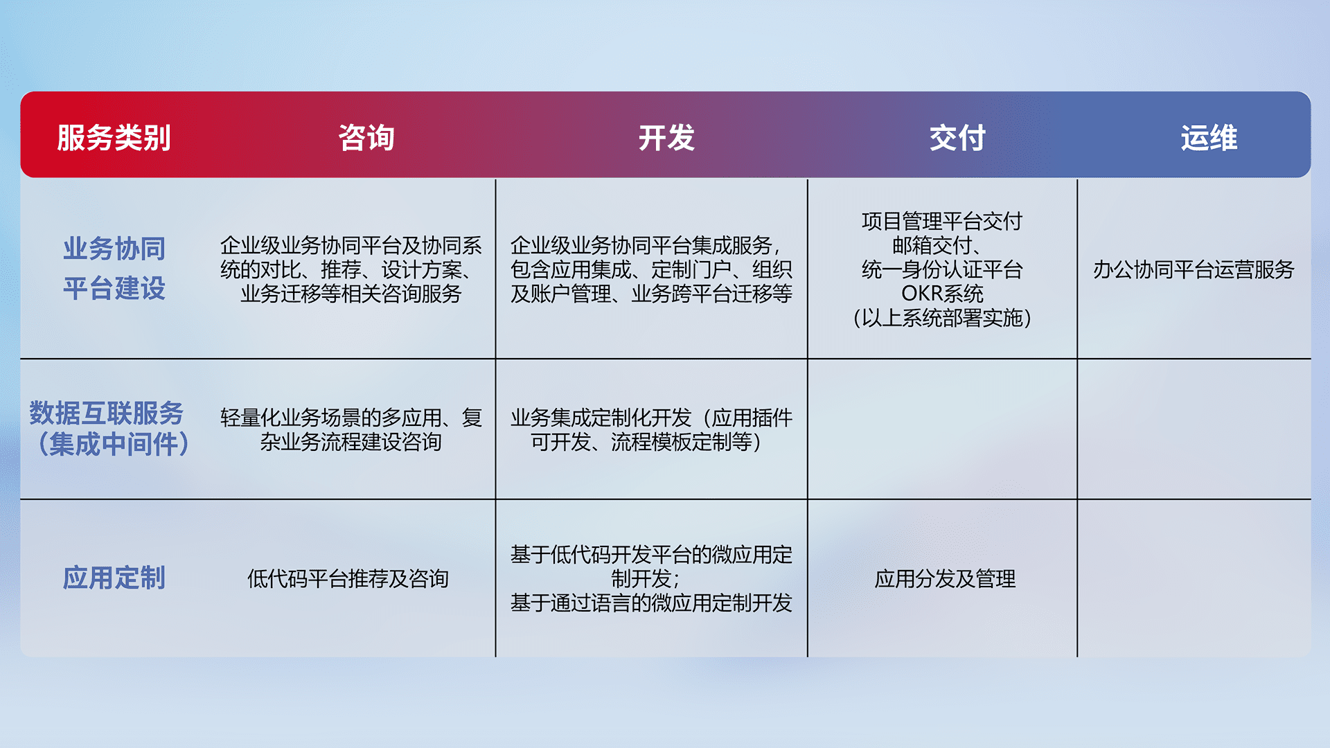 针对钉钉、、、企微、、、、IDaas等平台级产品提供产品的规划、、、、方案、、交付、、、、定制化开发等服务,,实现如统一协同办公、、、智能客户服务、、、、混合会议管理、、智能数据查询、、等业务场景,,实现数字化转型。。。